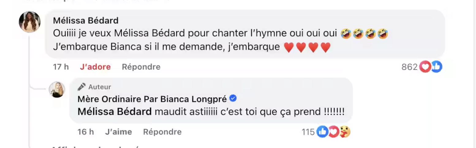 “Ouiiii je veux Mélissa Bédard pour chanter l’hymne oui oui oui. J’embarque Bianca s’il me demande, j’embarque.”